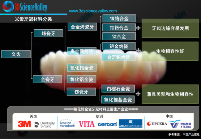 根据3D科学谷的市场观察,在各类义齿修复材料中,全瓷牙兼具美观性和生物相容性,预计未来临床普及率将不断提升。目前临床应用较多的义齿全瓷材料包括氧化锆基全瓷,氧化铝基全瓷、白榴石全瓷、氧化锂基全瓷等。根据东兴证券的估算,国内种植牙用的全瓷牙市场规模超过20亿元,未来潜在市场空间约200亿元。