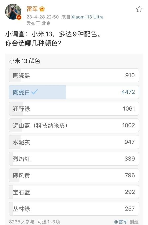 小米13系列已经完善,现在有着不错的价格,且一直在热销中,而日前雷军本人发布了一份关于配色的调查,看看哪个配色最受欢迎。