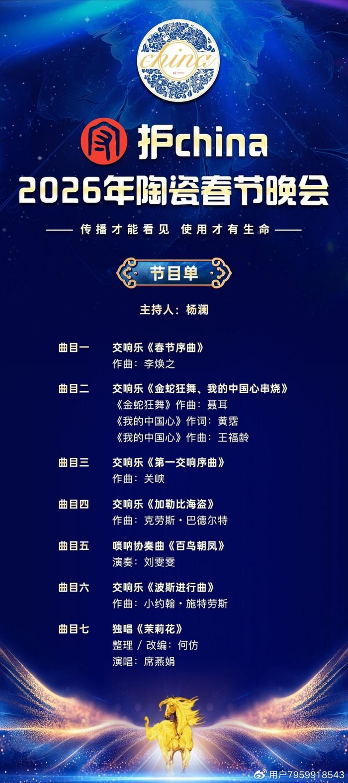 这场全国首个聚焦陶瓷界的专属春节晚会由主持人杨澜担纲主持,国家一级演员李胜素、高音歌唱家于浩磊、席燕娟等众星云集,指挥家张亮执棒上海爱乐乐团,将以交响、戏曲、声乐等多种艺术形式,创新演绎陶瓷穿越千年的文化叙事,联手打造一场融汇东方雅韵与西方经典、连接传统精神与当代气质的文化盛宴!