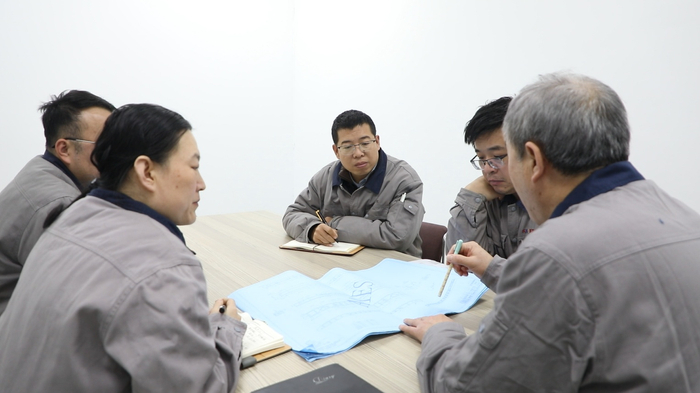杨东亮及其团队成员开会讨论工作一路闯关夺隘,研发团队在全产业链开发、专利突破的道路上稳步前行,用实力筑牢了产品的核心竞争力。杨东亮将突破归因于“专精特新”定位。